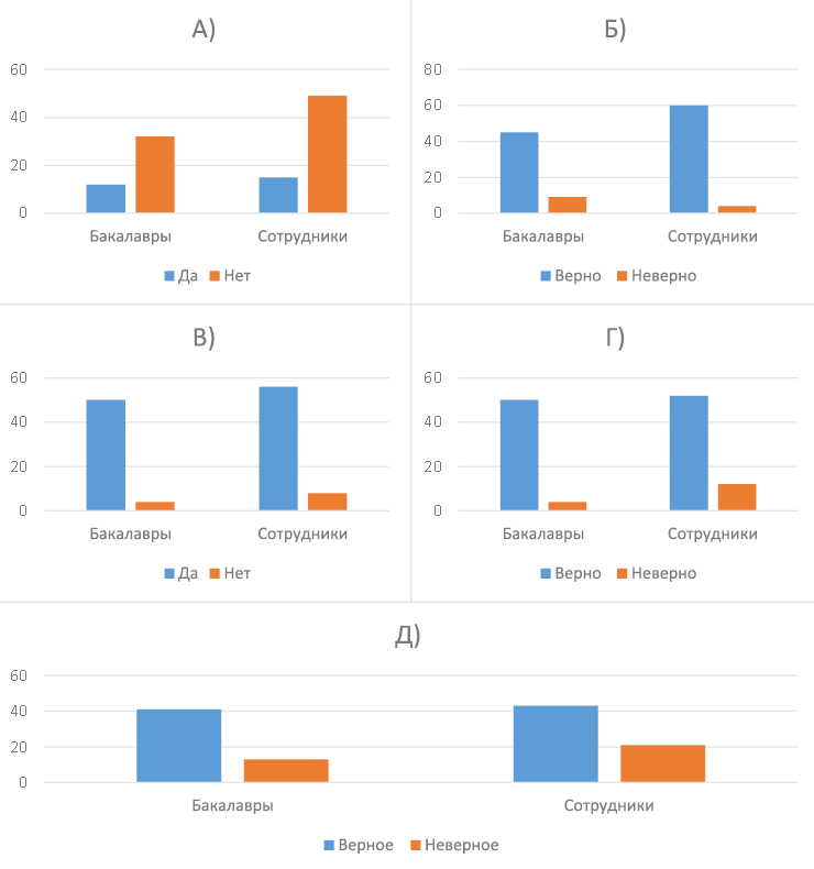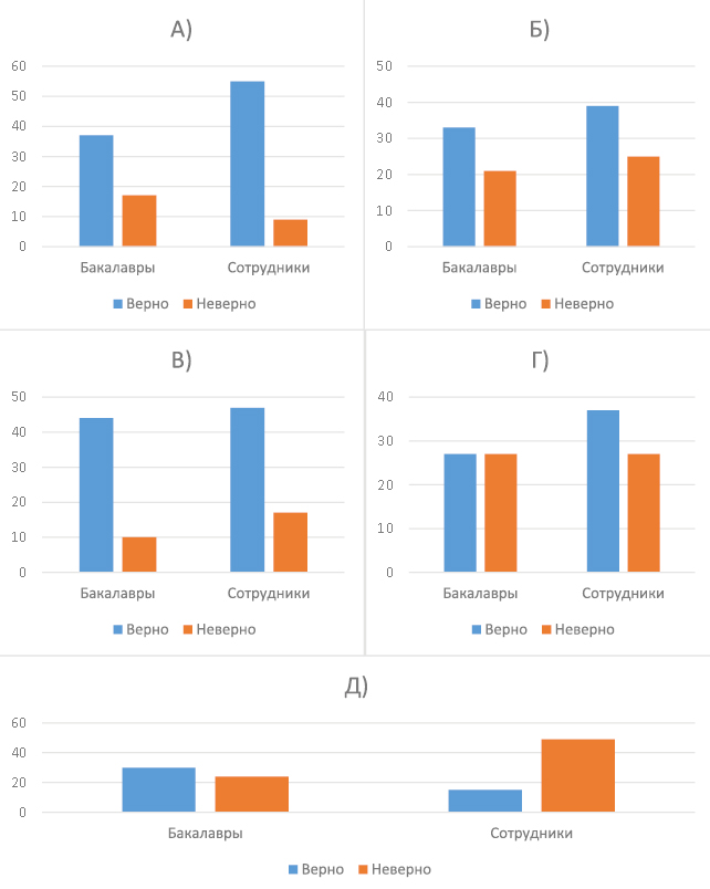 1. Рис. 1. Сравнение ответов бакалавров – выпускников БИД и сотрудников библиотек, часть 1. А) представление о планировании финансирования проекта, включающего волонтерскую деятельность (компетенция 1); Б) представление о включении проектов гражданской науки и научного волонтерства в деятельность различных типов и видов библиотек (компетенция 2); В) является ли библиотека научным коммуникатором (компетенция 2); Г) понимание отличий в организации массовых мероприятий и мероприятий при работе с проектами научного волонтерства и гражданской науки (компетенция 3); Д) ориентируются в возможных путях дополнения технологий коммуникации науки и общества библиотечными видами деятельности (компетенция 3) | |