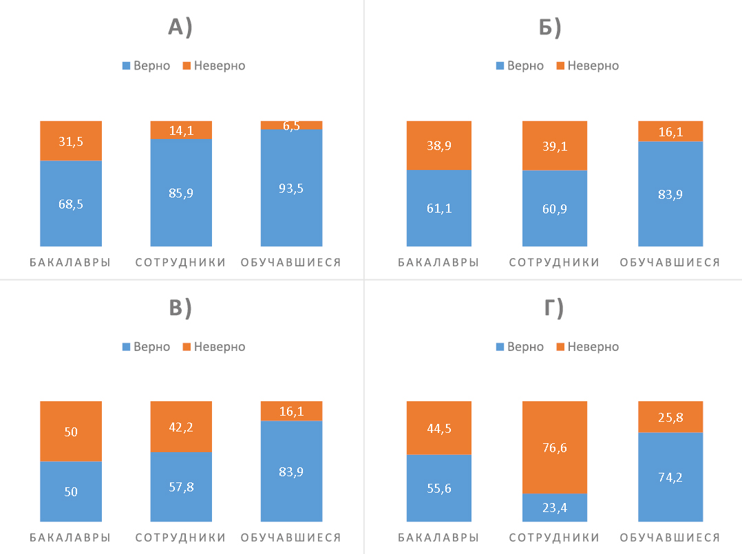 5. Рис. 5. Сравнение ответов выпускников БИД, сотрудников библиотек и обучающихся, окончивших КПК (в %), часть 2. А) указание лицензии, позволяющей перевести произведение в общественное достояние; Б) указание некоммерческого использования и запрета на создание производных произведений; В) указание на способ доведения до всеобщего сведения РИД; Г) корректное указание авторства произведения | |