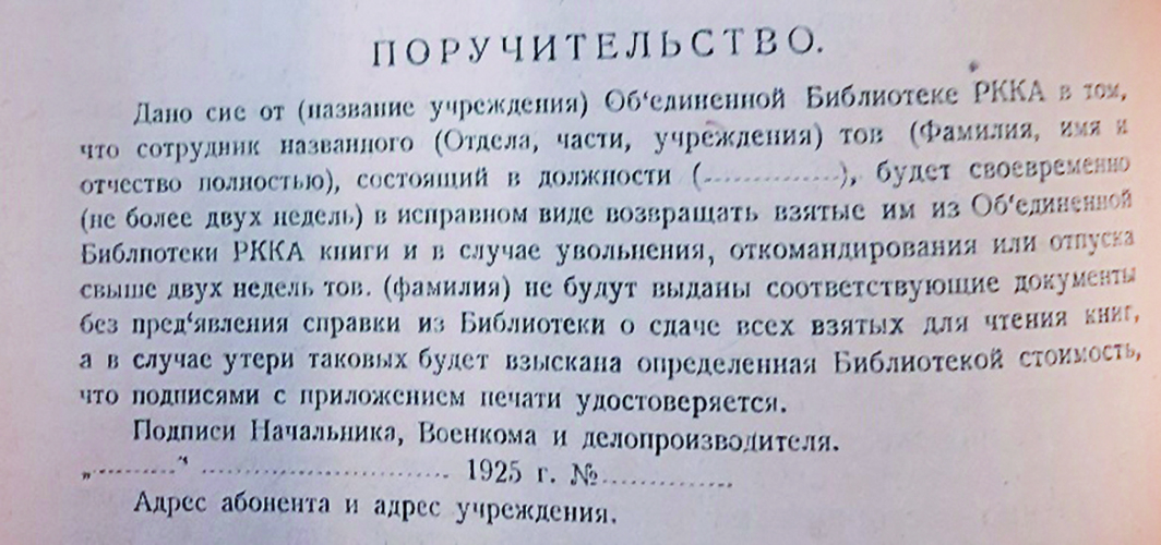 3. Рис. 3. Поручительство для пользования книгами Ленинградского отделения Объединенной библиотеки Рабоче-Крестьянской Красной Армии | |